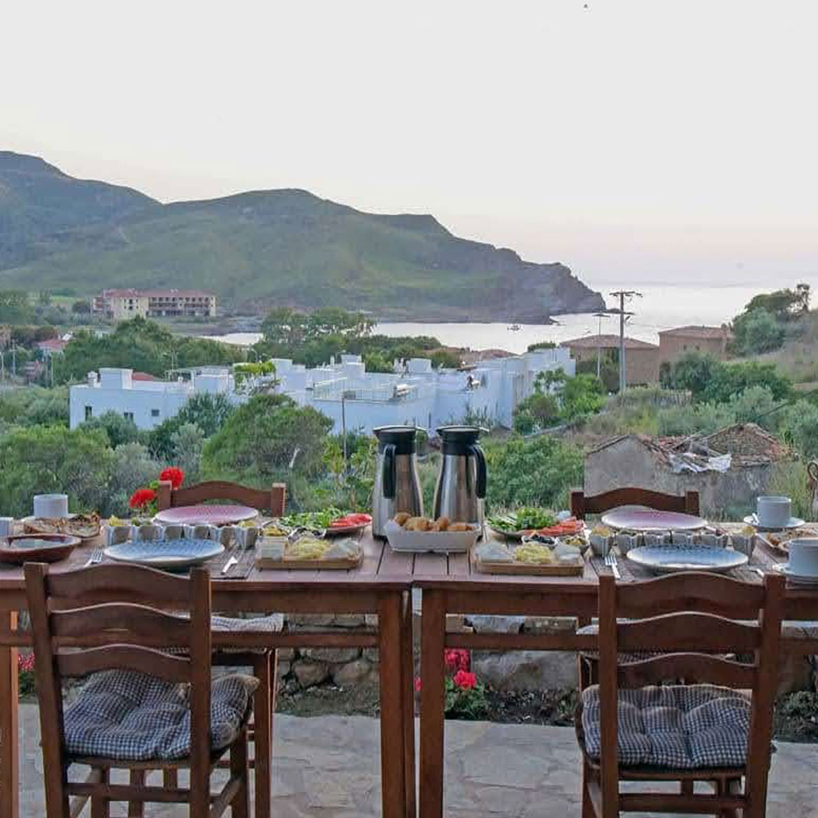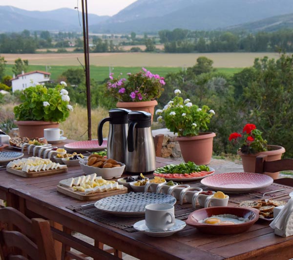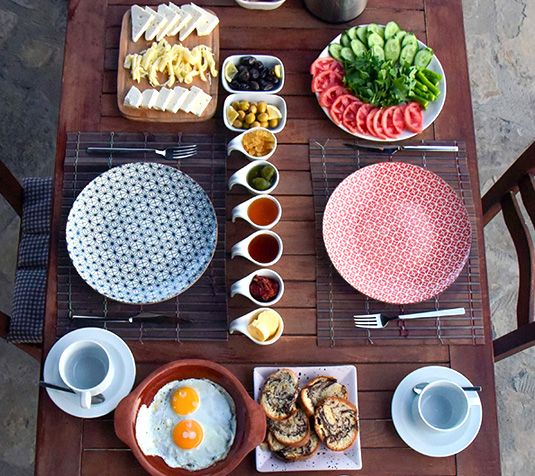 Misafirler sabahları tesisin bahçesinde, manzara eşliğinde ücretsiz olarak sunulan zengin bir serpme kahvaltı ile güne başlama imkanına sahipler.